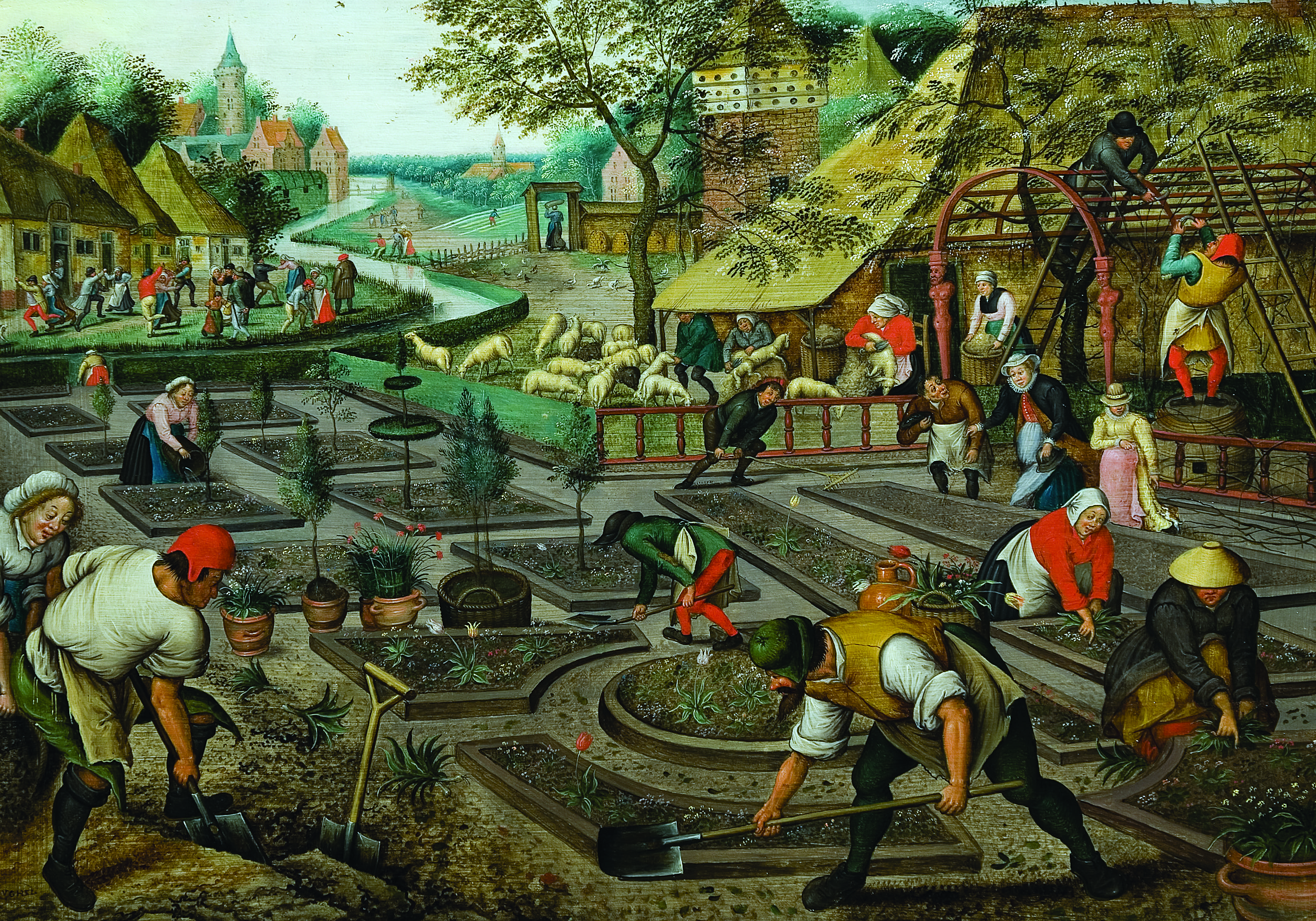 Spring sets the stage for the seasonal story as activities typically linked to March, April and May unfold before our eyes in successive picture planes. Numerous servants tend to an elaborate garden, sheare the sheep, cut back the vine and roses under the watchfull eyes of well-dressed masters. Before glimpsing into the distant landscape have a look at the merry-making villagers balancing all the hard work with a dance at the local inn.